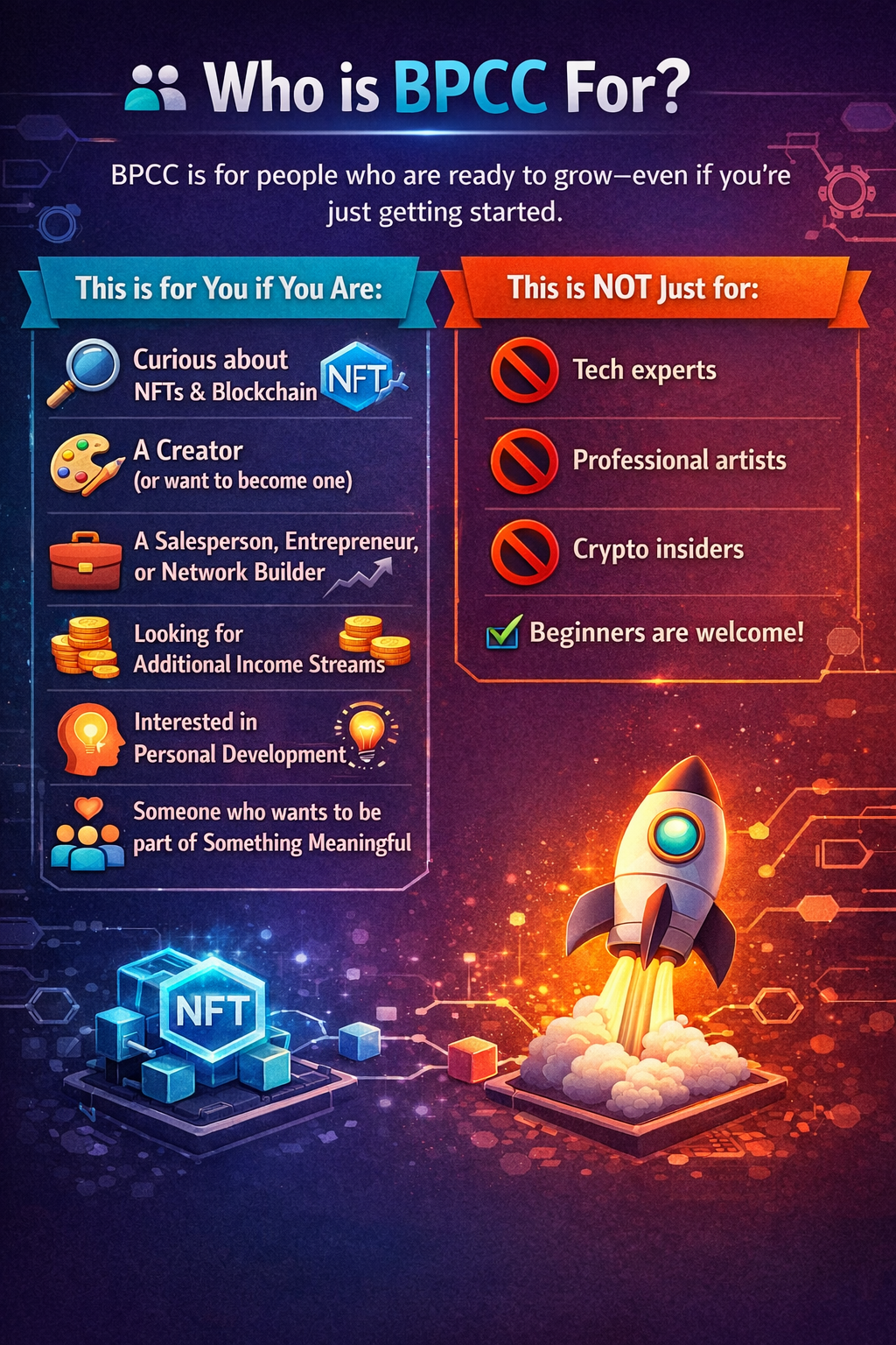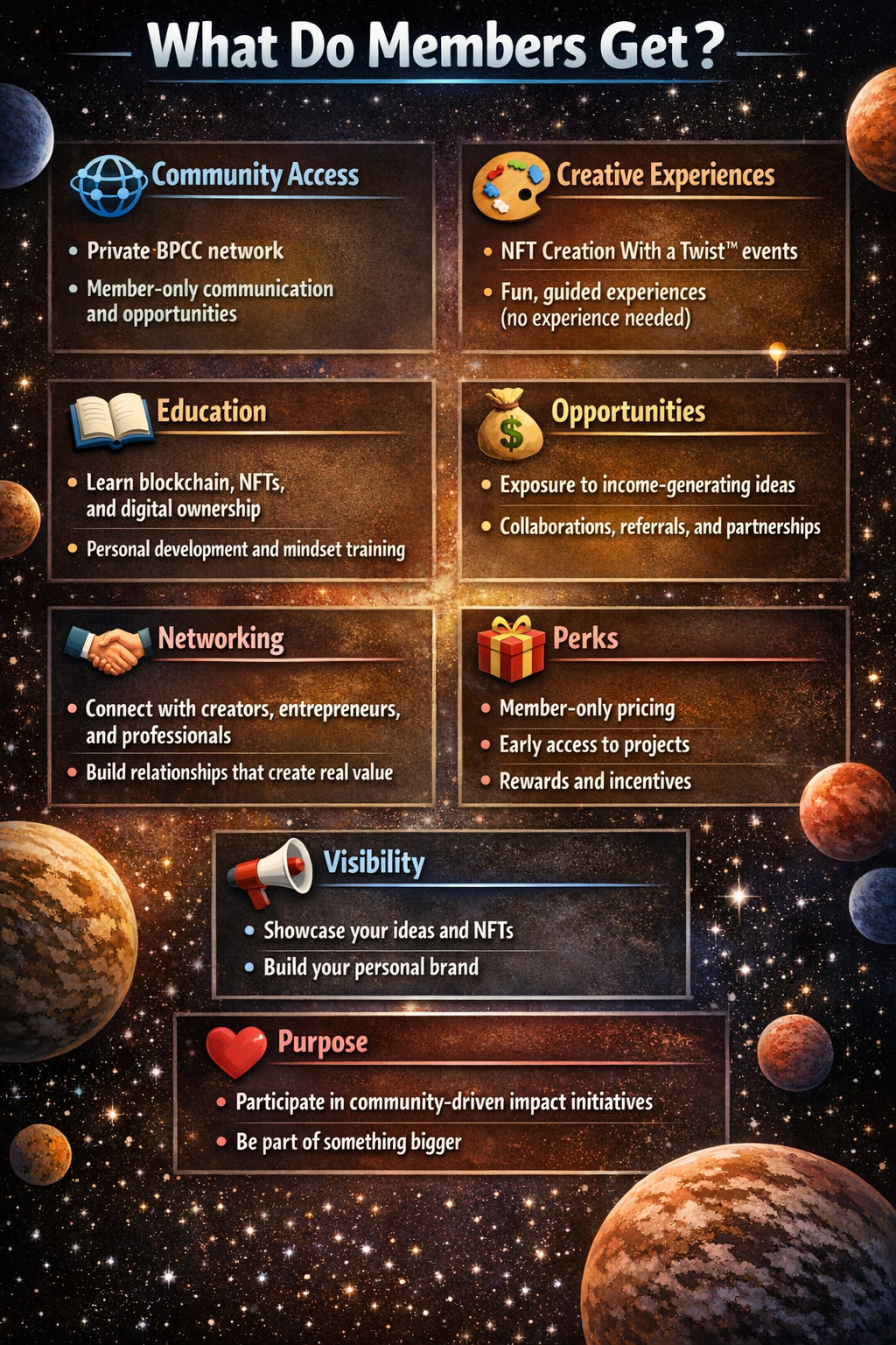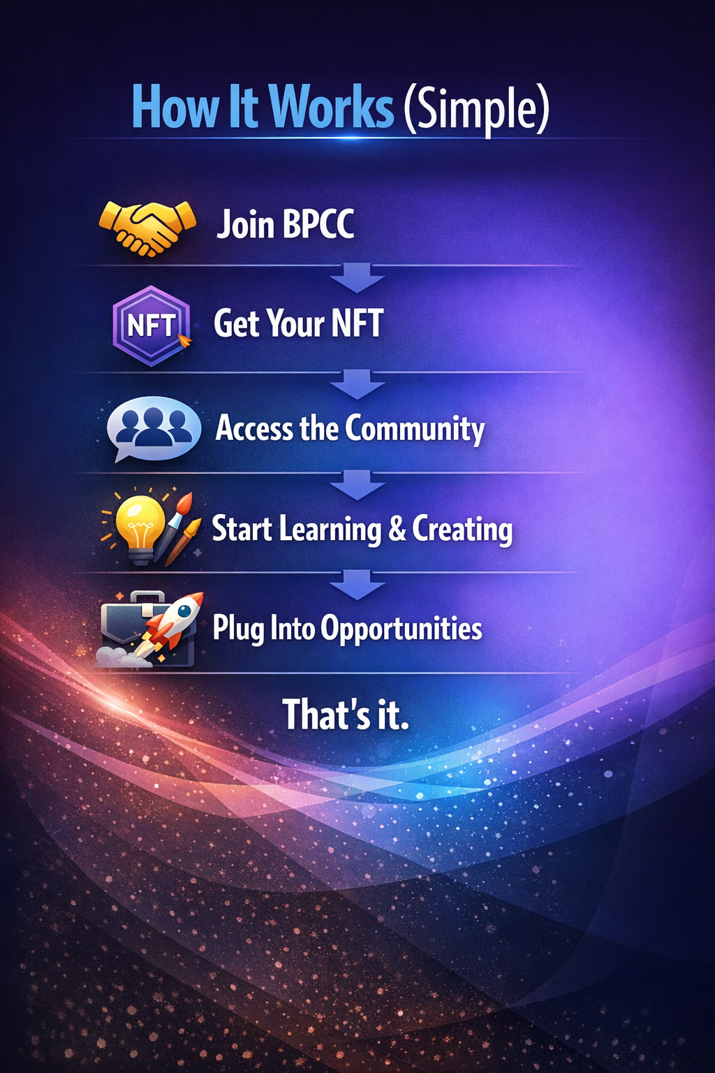 Join BPCC Get Your NFT Access the Community Start Learning & Creating Plug Into Opportunities