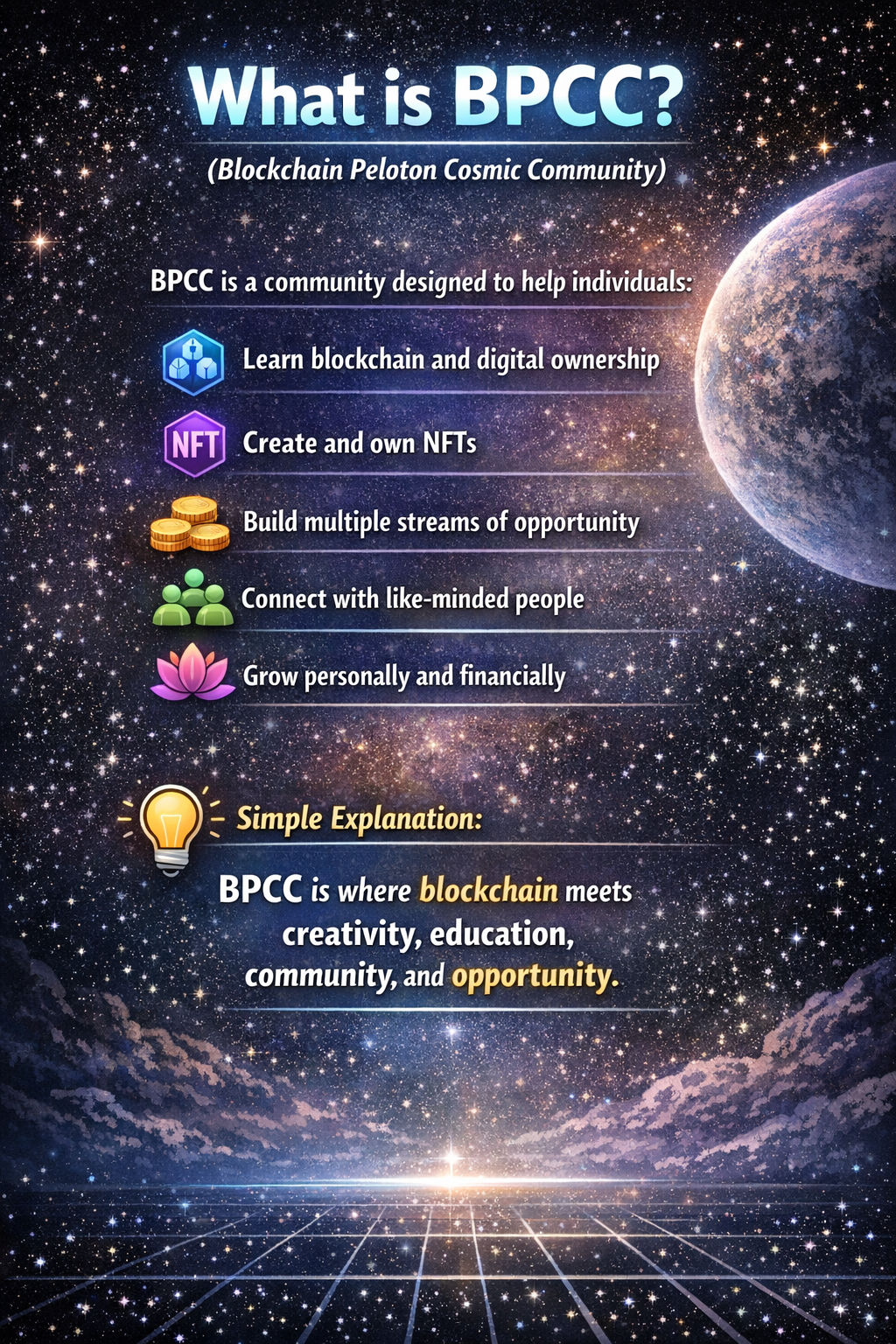 BPCC (Blockchain Peloton Cosmic Community) is a community designed to help individuals: Learn blockchain and digital ownership Create and own NFTs Build multiple streams of opportunity Connect with like-minded people Grow personally and financially