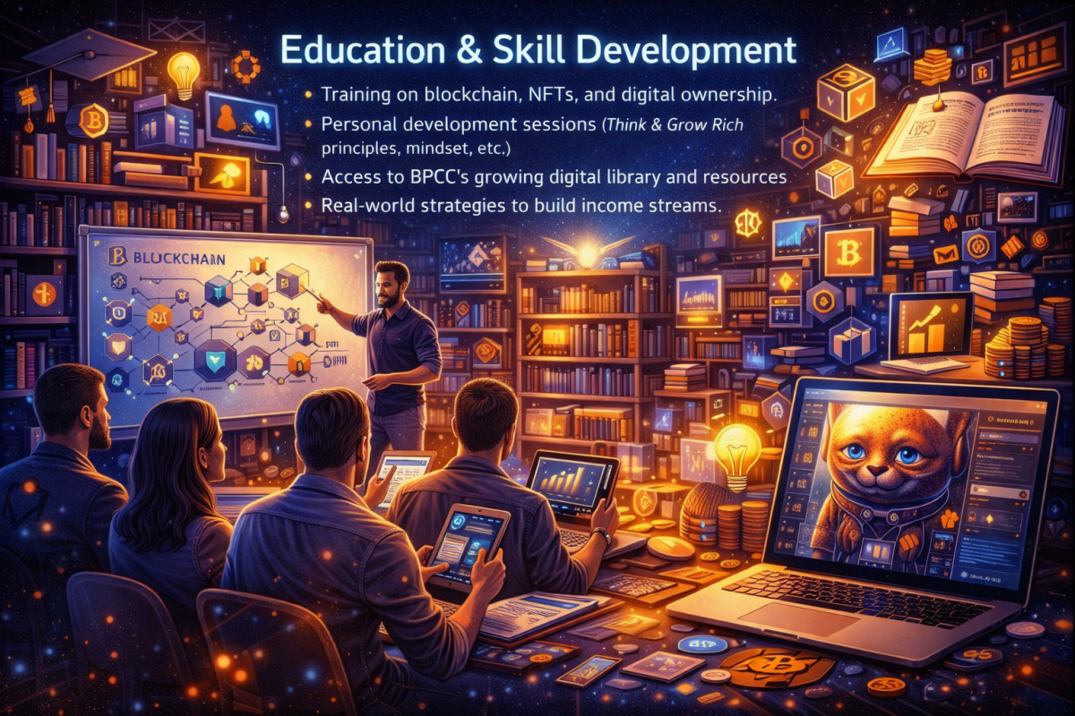 Training on blockchain, NFTs, and digital ownership Personal development sessions (Think & Grow Rich principles, mindset, etc.) Access to BPCC’s growing digital library and resources Real-world strategies to build income streams