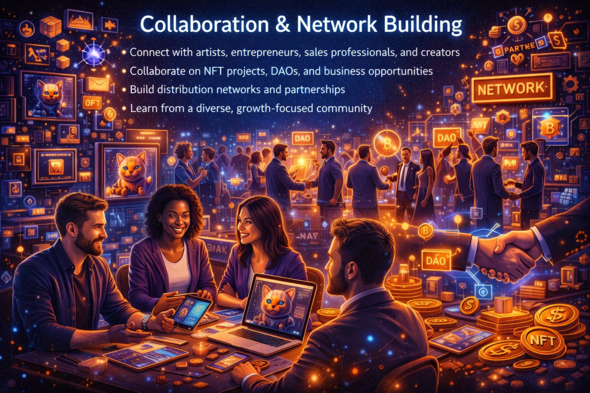 Connect with artists, entrepreneurs, sales professionals, and creators Collaborate on NFT projects, DAOs, and business opportunities Build distribution networks and partnerships Learn from a diverse, growth-focused community