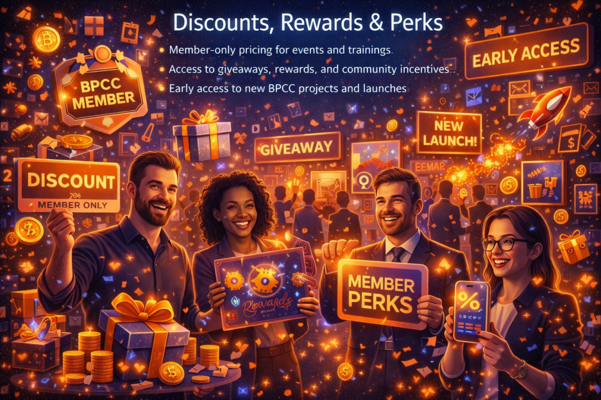 Member-only pricing for events and trainings Access to giveaways, rewards, and community incentives Early access to new BPCC projects and launches