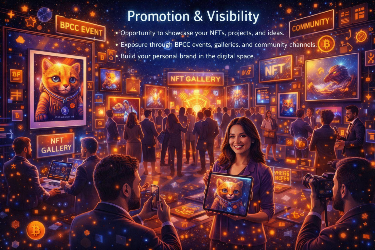 Opportunity to showcase your NFTs, projects, and ideas Exposure through BPCC events, galleries, and community channels Build your personal brand in the digital space